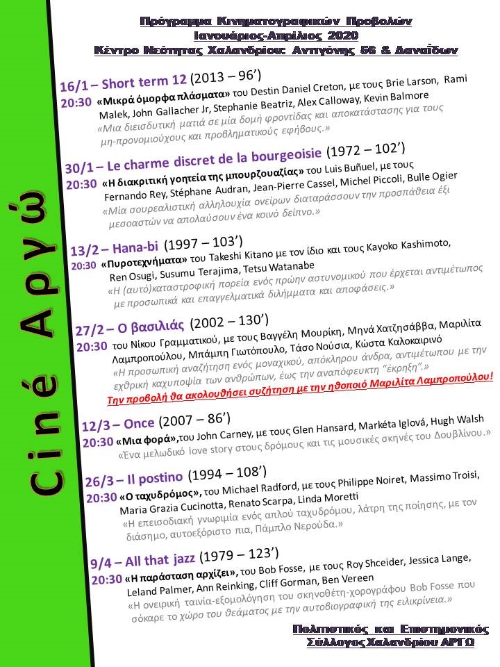 Ο Πολιτιστικός - Επιστημονικός Σύλλογος Χαλανδρίου ΑΡΓΩ παρουσιάζει το πρόγραμμα κινηματογραφικών προβολών του Cine ΑΡΓΩ για το διάστημα Ιανουάριος - Απρίλιος 2020, που πραγματοποιούνται στο Κέντρο Νεότητας Χαλανδρίου (Αντιγόνης 56 & Δαναΐδων), με ώρα έναρξης 20:30 και ελεύθερη είσοδο: