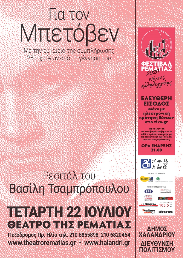 Μια βραδιά “Για τον Μπετόβεν” θα έχουν την ευκαιρία να απολαύσουν όσοι και όσες παρακολουθήσουν το ρεσιτάλ του Βασίλη Τσαμπρόπουλου που φιλοξενεί το Φεστιβάλ Ρεματιάς 2020 “Νύχτες Αλληλεγγύης”, την Τετάρτη 22 Ιουλίου, στις 9:00 το βράδυ.