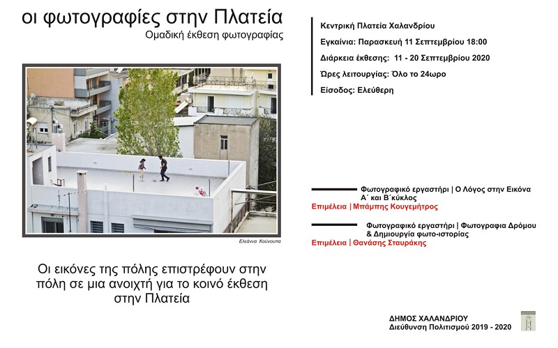 Συνολικά 33 ερασιτέχνες φωτογράφοι, συμμετέχοντες στα δύο καλλιτεχνικά εργαστήρια του Δήμου Χαλανδρίου «Φωτογραφία Δρόμου και Δημιουργία Φωτο-Ιστορίας» με εισηγητή τον Θανάση Σταυράκη και «Ο λόγος στην Εικόνα» (Α’ & Β’ Κύκλος) με εισηγητή τον Μπάμπη Κουγεμήτρο, παρουσιάζουν τη δουλειά τους στην έκθεση «Η φωτογραφία στην Πλατεία», στην κεντρική πλατεία Χαλανδρίου από την Παρασκευή 11 Σεπτεμβρίου, στις 18:00.