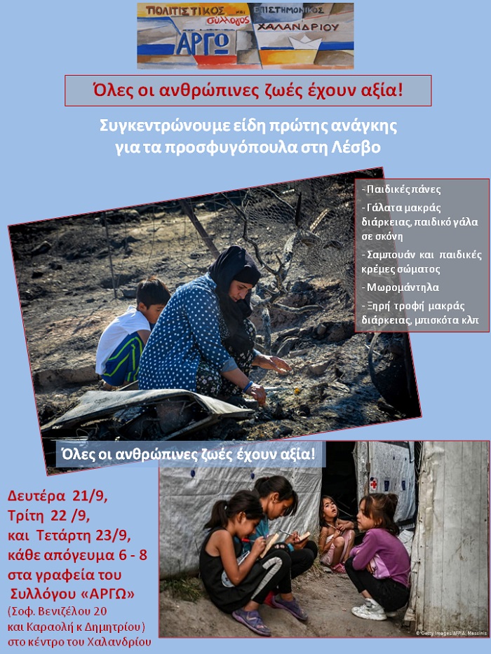 Με σύνθημα «Όλες οι ανθρώπινες ζωές έχουν αξία!», ο Πολιτιστικός - Επιστημονικός Σύλλογος Χαλανδρίου «ΑΡΓΩ» συγκεντρώνει στα γραφεία του είδη πρώτης ανάγκης για τα προσφυγόπουλα στη Λέσβο.