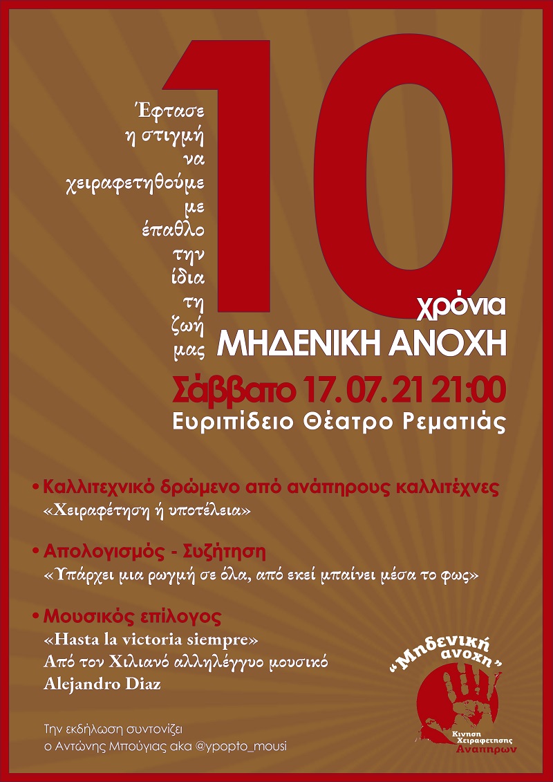 Σας προσκαλούμε το Σάββατο 17 Ιουλίου 2021 και ώρα 21:00, στο φιλικό και προσβάσιμο Ευριπίδειο Θέατρο της Ρεματιάς να γιορτάσουμε τα 10 χρόνια δράσης της Κίνησης Χειραφέτησης Αναπήρων: ΜΗΔΕΝΙΚΗ ΑΝΟΧΗ. Δέκα χρόνια γεμάτα δράσεις για τη διεκδίκηση των αυτονόητων.