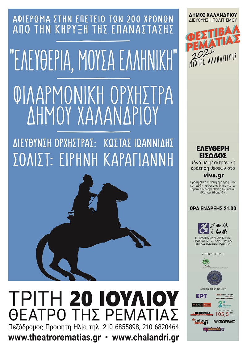 Τη συναυλία “Ελευθερία, Μούσα Ελληνική”, αφιερωμένη στην επέτειο των 200 χρόνων από την κήρυξη της Ελληνικής Επανάστασης, παρουσιάζει στο Φεστιβάλ Ρεματιάς 2021 “Νύχτες Αλληλεγγύης”, η Φιλαρμονική Ορχήστρα του Δήμου Χαλανδρίου, την Τρίτη 20 Ιουλίου, υπό τη διεύθυνση του Κώστα Ιωαννίδη, με σολίστ την Ειρήνη Καράγιαννη.