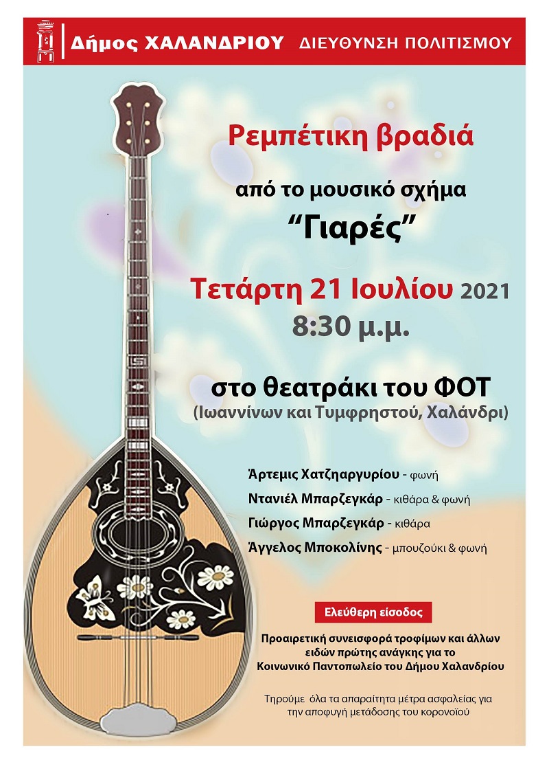 Μια ρεμπέτικη βραδιά με ελεύθερη είσοδο παρουσιάζει, την Τετάρτη 21 Ιουλίου, στις 8:30 μ.μ., στο ανοιχτό θεατράκι του ΦΟΤ (Τυμφρηστού & Ιωαννίνων), το Φεστιβάλ Ρεματιάς 2021 “Νύχτες Αλληλεγγύης”, με το μουσικό σχήμα Γιαρές.