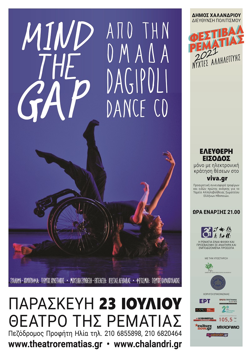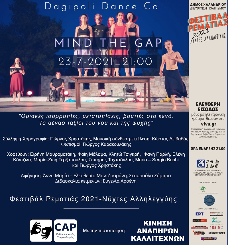Την προσβάσιμη στο περιεχόμενο παράσταση σύγχρονου χορού “Mind the gap” από την ομάδα Dagipoli Dance Co, παρουσιάζει το Φεστιβάλ Ρεματιάς 2021 “Νύχτες Αλληλεγγύης”, την Παρασκευή 23 Ιουλίου.