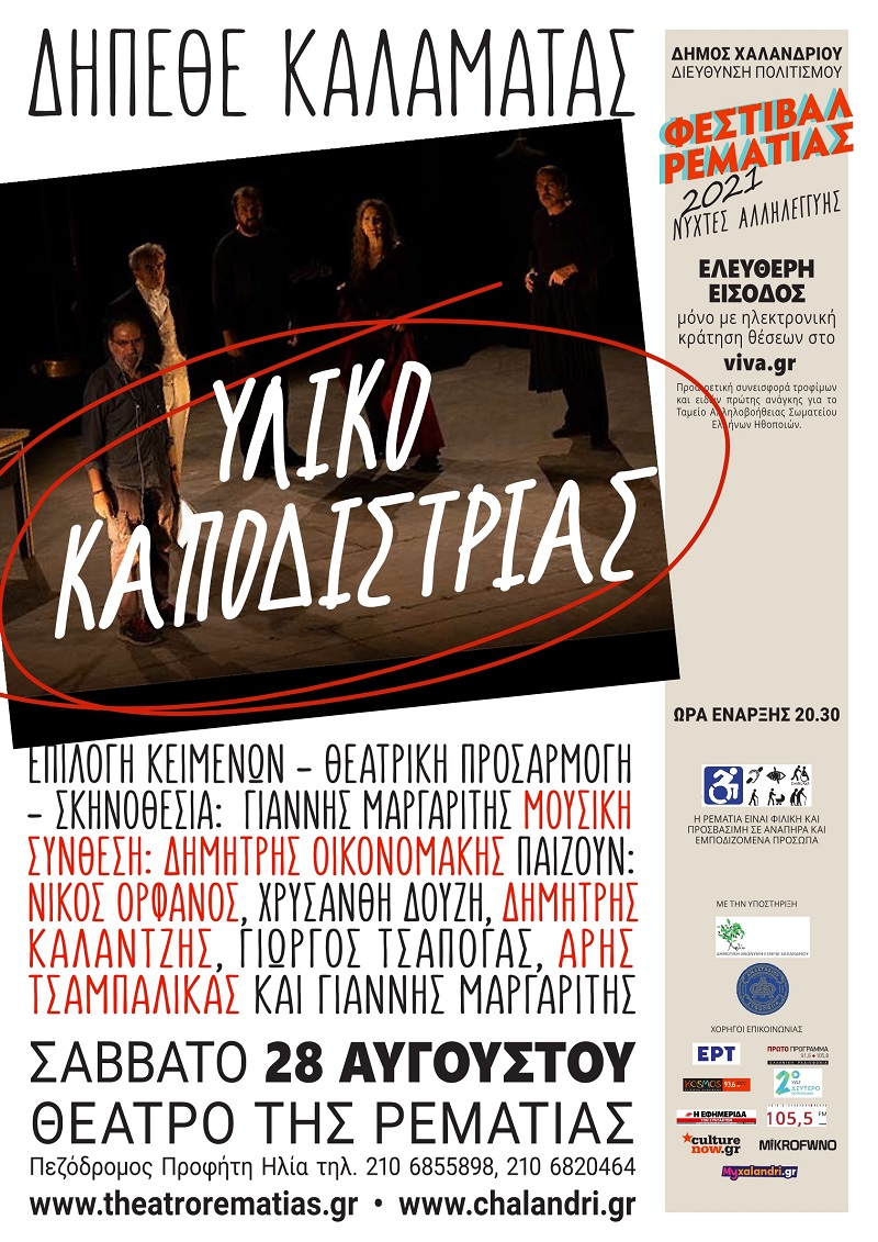Τη θεατρική παράσταση “Υλικό Καποδίστριας” παρουσιάζει στο Φεστιβάλ Ρεματιάς 2021 “Νύχτες Αλληλεγγύης”, το Σάββατο 28 Αυγούστου, το ΔΗ.ΠΕ.ΘΕ. Καλαμάτας σε συνεργασία με την Περιφέρεια Πελοποννήσου και το ΔΗ.ΠΕ.ΘΕ. Ρούμελης, με την ευκαιρία του εορτασμού των 200 χρόνων από την Επανάσταση του 1821.