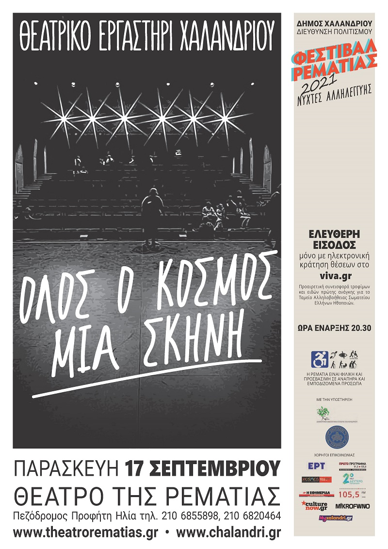 Την παράσταση Όλος ο Κόσμος μια Σκηνή”  σε σκηνοθεσία Αγνής Χιώτη παρουσιάζει στο Φεστιβάλ Ρεματιάς 2021 “Νύχτες Αλληλεγγύης”, το Θεατρικό Εργαστήρι Χαλανδρίου την Παρασκευή 17 Σεπτεμβρίου.