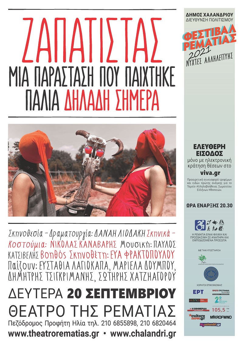 Την πρεμιέρα της θεατρικής παράστασης “Ζαπατίστας - Μια παράσταση που παίχτηκε παλιά δηλαδή σήμερα” σε σκηνοθεσία της Δανάης Λιοδάκη παρουσιάζει το Φεστιβάλ Ρεματιάς 2021 “Νύχτες Αλληλεγγύης”, τη Δευτέρα 20 Σεπτεμβρίου.