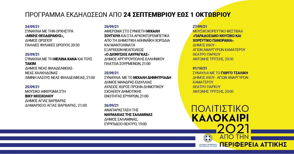 Η πολιτιστική εβδομάδα ξεκινάει σήμερα Παρασκευή 24 Σεπτεμβρίου με ένα αφιέρωμα της Περιφέρειας Αττικής στον σπουδαίο Μίκη Θεοδωράκη με την Ορχήστρα «Μίκης Θεοδωράκης» στις παλιές φυλακές Ωρωπού και τελειώνει την Παρασκευή 1η Οκτωβρίου, οπότε και ολοκληρώνεται το πολιτιστικό πρόγραμμα της Περιφέρειας Αττικής για το καλοκαίρι 2021.