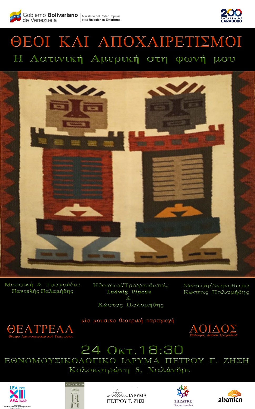 Τη μουσικοθεατρική παράσταση «Θεοί και Αποχαιρετισμοί - Η Λατινική Αμερική στη φωνή μου» παρουσιάζει η πρεσβεία της Μπολιβαριανής Δημοκρατίας της Βενεζουέλας στην Ελλάδα, στο πλαίσιο του 13ου Φεστιβάλ Ελληνο - Ιβηροαμερικανικής «Λογοτεχνίας εν Αθήναις» (Φεστιβάλ ΛΕΑ), την Κυριακή 24 Οκτωβρίου 2021 στις 18:30, στο Εθνομουσικολογικό Ίδρυμα Πέτρου Γ. Ζήση (Κολοκοτρώνη 5, Χαλάνδρι).