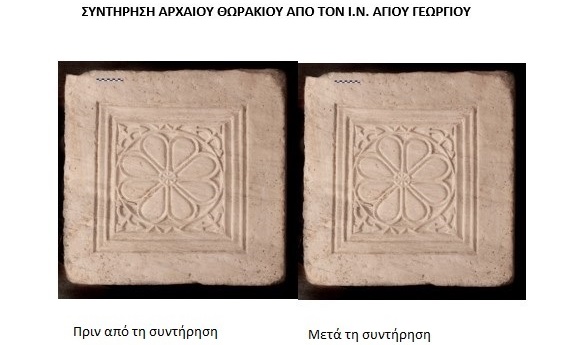 Συγκεκριμένα, οι εργασίες συντήρησης συμπεριέλαβαν το αρχαίο θωράκιο από τον Ιερό Ναό του Αγίου Γεωργίου και τον μητρωικό βωμό, από τον ίδιο ναό.
