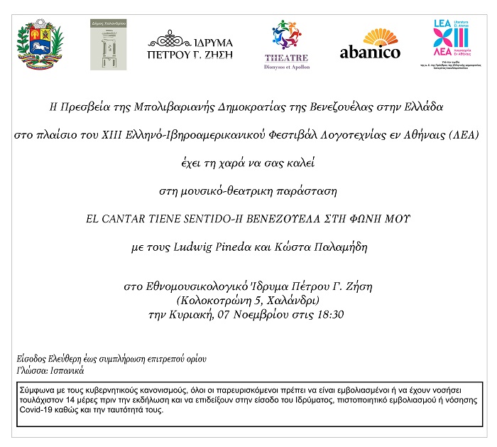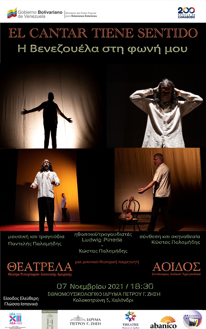Η πρεσβεία της Μπολιβαριανής Δημοκρατίας της Βενεζουέλας, με τη στήριξη του Δήμου Χαλανδρίου, γιορτάζοντας τη νέα Εθνική Μέρα Θεάτρου της χώρας καθώς και τη δυναμική που του προσέδωσε ο Σιμόν Μπολιβάρ, παρουσιάζει τη μουσικοθεατρική παράσταση «Η Βενεζουέλα στη φωνή μου - El cantar tiene sentido», στο πλαίσιο του 13ου Φεστιβάλ Ελληνο-Ιβηροαμερικανικής «Λογοτεχνίας εν Αθήναις».