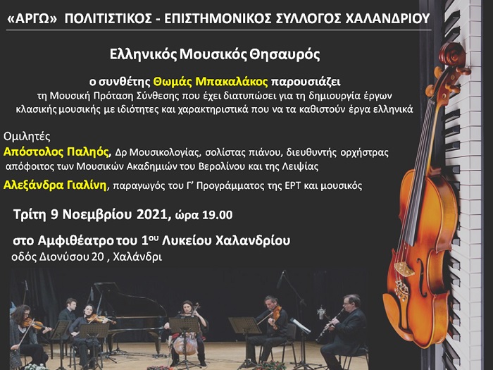Ο Πολιτιστικός - Επιστημονικός Σύλλογος Χαλανδρίου «ΑΡΓΩ» διοργανώνει εκδήλωση με θέμα «Ελληνικός Μουσικός Θησαυρός», την Τρίτη 9 Νοεμβρίου 2021, ώρα 19:00, στο Αμφιθέατρο του 1ου Λυκείου Χαλανδρίου (Διονύσου 20).