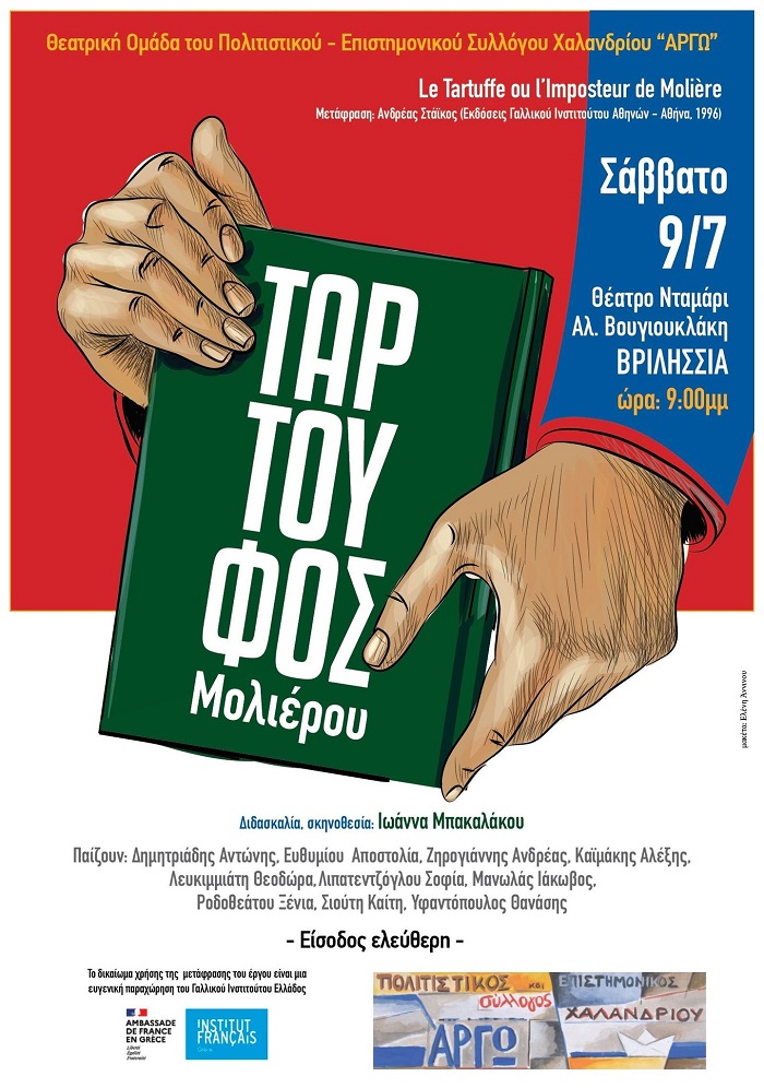 H Θεατρική Ομάδα του Πολιτιστικού - Επιστημονικού Συλλόγου Χαλανδρίου ΑΡΓΩ με το έργο του Μολιέρου «Ο Ταρτούφος» συμμετέχει το Σάββατο 9 Ιουλίου 2022 και ώρα 9:00 μ.μ., στο 1ο Φεστιβάλ Ερασιτεχνικού Θεάτρου που διοργανώνει ο Δήμος Βριλησσίων στο Θέατρο Νταμάρι - Αλίκη Βουγιουκλάκη (Μεταμόρφωσης Σωτήρος & Υψηλάντου, Άνω Βριλήσσια).