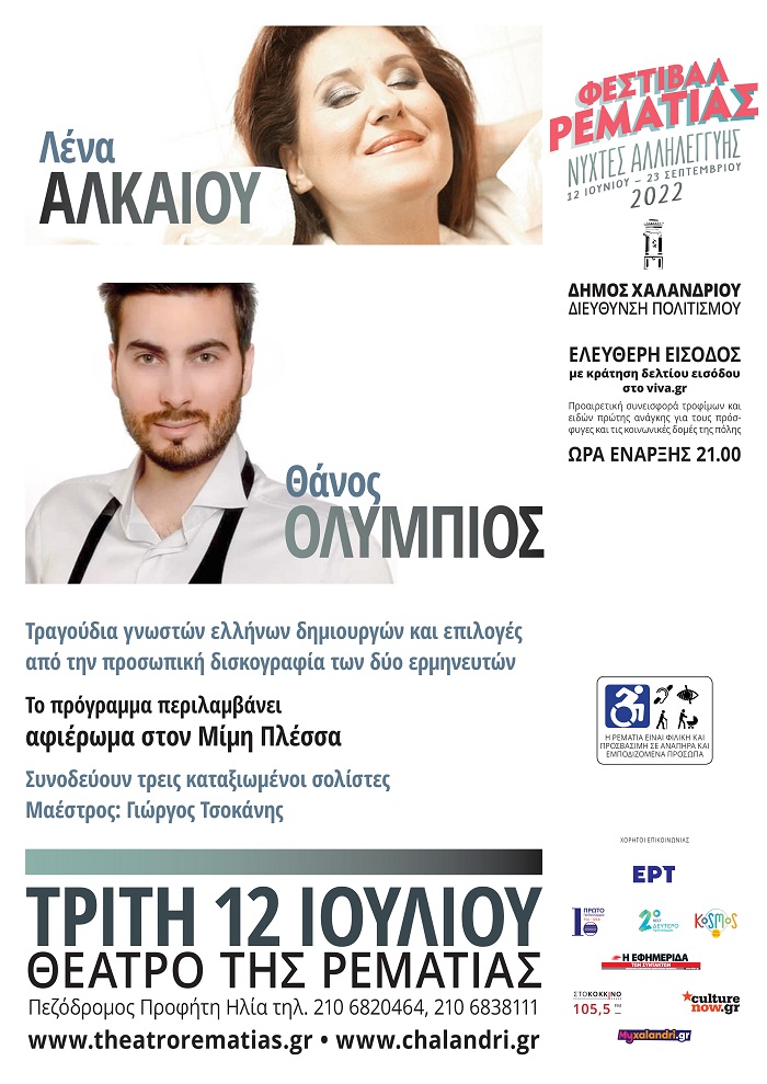 Τους ερμηνευτές Λένα Αλκαίου και Θάνο Ολύμπιο να παρουσιάζουν τραγούδια σημαντικών Eλλήνων δημιουργών και επιλογές από την προσωπική τους δισκογραφία φιλοξενεί το Φεστιβάλ Ρεματιάς 2022 - Νύχτες Αλληλεγγύης, την Τρίτη 12 Ιουλίου. Η μουσική βραδιά περιλαμβάνει και αφιέρωμα στον Μίμη Πλέσσα ενώ τους δύο ερμηνευτές θα συνοδεύσουν τρεις καταξιωμένοι σολίστες μουσικοί με μαέστρο τον Γιώργο Τσοκάνη.