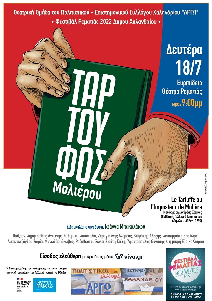 Τη Δευτέρα 18 Ιουλίου 2022, στις 9:00 μ.μ., η Θεατρική Ομάδα του Πολιτιστικού - Επιστημονικού Συλλόγου Χαλανδρίου ΑΡΓΩ παρουσιάζει στο Ευριπίδειο Θέατρο Ρεματιάς, στα πλαίσια του Φεστιβάλ Ρεματιάς 2022 - Νύχτες Αλληλεγγύης, το έργο «Ο Ταρτούφος» του Μολιέρου σε διδασκαλία/σκηνοθεσία Ιωάννας Μπακαλάκου.