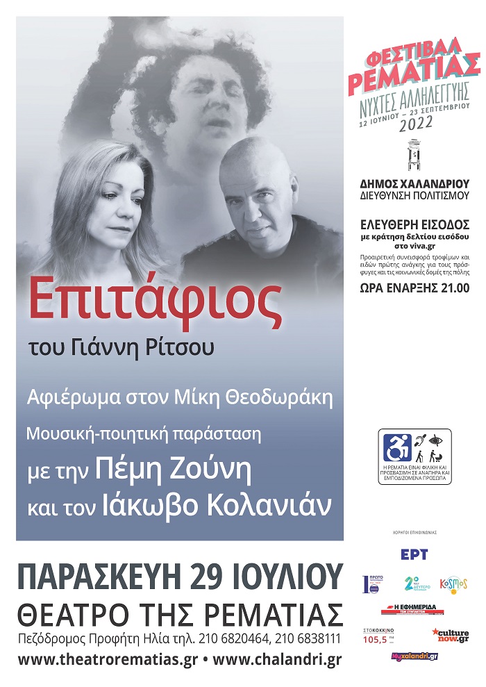 Μουσική - ποιητική παράσταση, αφιέρωμα στον Μίκη Θεοδωράκη, με την Πέμη Ζούνη και τον Ιάκωβο Κολανιάν να παρουσιάζουν το έργο “Επιτάφιος” του Γιάννη Ρίτσου, φιλοξενεί το Φεστιβάλ Ρεματιάς 2022 - Νύχτες Αλληλεγγύης, την Παρασκευή 29 Ιουλίου.