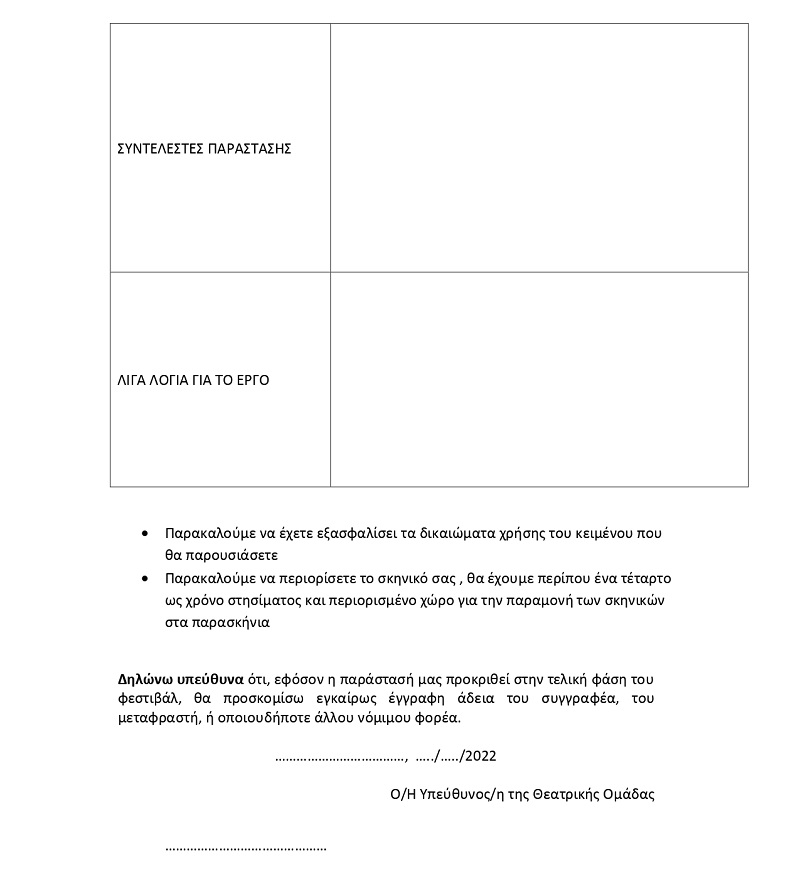 Οι ομάδες μπορούν να δηλώνουν συμμετοχή στα e-mail: Αυτή η διεύθυνση ηλεκτρονικού ταχυδρομείου προστατεύεται από τους αυτοματισμούς αποστολέων ανεπιθύμητων μηνυμάτων. Χρειάζεται να ενεργοποιήσετε τη JavaScript για να μπορέσετε να τη δείτε. και Αυτή η διεύθυνση ηλεκτρονικού ταχυδρομείου προστατεύεται από τους αυτοματισμούς αποστολέων ανεπιθύμητων μηνυμάτων. Χρειάζεται να ενεργοποιήσετε τη JavaScript για να μπορέσετε να τη δείτε. στέλνοντας την αίτηση συμμετοχής, καθώς και ένα βίντεο του θεατρικού αποσπάσματος που θα παρουσιάσουν.
