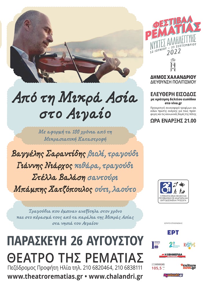 Τη μουσική βραδιά για τα 100 χρόνια από τη Μικρασιατική Καταστροφή, “Από τη Μικρά Ασία στο Αιγαίο”, παρουσιάζει, την Παρασκευή 26 Αυγούστου, το Φεστιβάλ Ρεματιάς 2022 - Νύχτες Αλληλεγγύης.