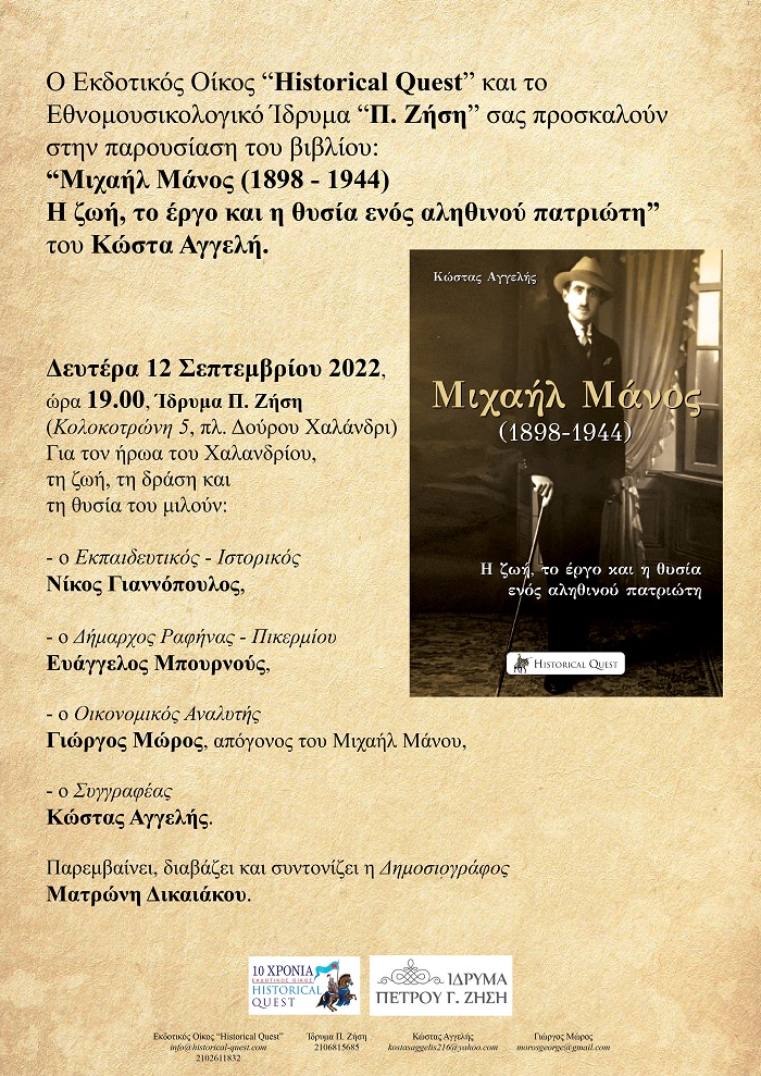 Ο Εκδοτικός Οίκος "Historical Quest" και το Εθνομουσικολογικό Ίδρυμα "Π. Ζήση" προσκαλούν στην παρουσίαση του βιβλίου: «Μιχαήλ Μάνος (1898-1944) - Η ζωή, το έργο και η θυσία ενός αληθινού πατριώτη» του Κώστα Αγγελή.