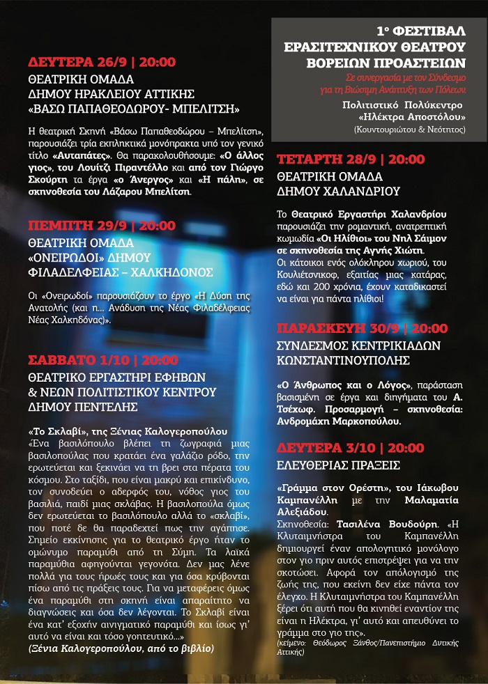 Την Κυριακή στις 25 Σεπτεμβρίου 2022 και ώρα 20:00 ξεκινάει στο Πολιτιστικό Κέντρο «Ηλέκτρα Αποστόλου», Ηράκλειο Αττικής, το «1ο Φεστιβάλ Ερασιτεχνικού Θεάτρου» που συνδιοργανώνουν ο Σύνδεσμος για τη Βιώσιμη Ανάπτυξη των Πόλεων (Σ.Β.Α.Π.) και ο Δήμος Ηρακλείου Αττικής.