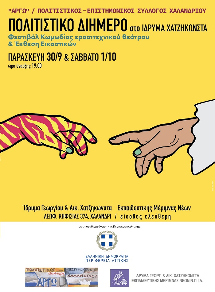 Ο Πολιτιστικός - Επιστημονικός Σύλλογος Χαλανδρίου «ΑΡΓΩ» συνδιοργανώνει με το Ίδρυμα Γεωργίου & Αικ. Χατζηκώνστα - Εκπαιδευτικής Μέριμνας Νέων και την ευγενική στήριξη της Περιφέρειας Αττικής, Πολιτιστικό Διήμερο την Παρασκευή 30 Σεπτεμβρίου και το Σάββατο 1 Οκτωβρίου 2022, στις εγκαταστάσεις του Ιδρύματος που βρίσκονται στη Λεωφόρο Κηφισίας 374, στο Χαλάνδρι.