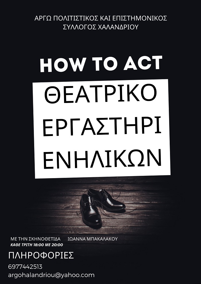 Ο Πολιτιστικός - Επιστημονικός Σύλλογος Χαλανδρίου «ΑΡΓΩ» και η Θεατρική του Ομάδα διοργανώνουν Εργαστήριο Υποκριτικής και καλούν όποιον/όποια ενδιαφέρεται να δηλώσει συμμετοχή.