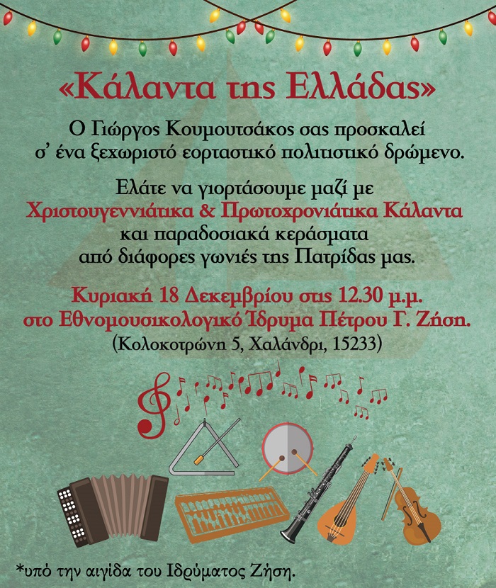 Την Κυριακή 18 Δεκεμβρίου στις 12:30 μ.μ., το Ίδρυμα Ζήση, στο Χαλάνδρι, βάζει τα γιορτινά του. Οικοδεσπότης ο Γιώργος Κουμουτσάκος σε μια Χριστουγεννιάτικη εκδήλωση βγαλμένη από την ελληνική παράδοση.