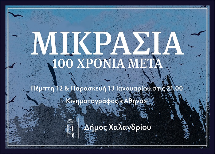 Ο Δήμος Χαλανδρίου, τιμώντας τον προσφυγικό ελληνισμό και την επέτειο των 100 χρόνων από τη Μικρασιατική Καταστροφή, προχώρησε στην παραγωγή του ντοκιμαντέρ έρευνας «Μικρασία 100 χρόνια μετά», το οποίο θα παρουσιαστεί σε πρώτη προβολή την Πέμπτη 12 & την Παρασκευή 13 Ιανουαρίου 2023, στον κινηματογράφο «Αθηνά», στις 21:00.