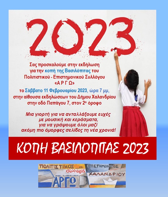 Το Διοικητικό Συμβούλιο του Πολιτιστικού - Επιστημονικού Συλλόγου Χαλανδρίου «ΑΡΓΩ» προσκαλεί στην εκδήλωση για την κοπή της Βασιλόπιτας, το Σάββατο 11 Φεβρουαρίου 2023 και ώρα 7:00 μ.μ., στην αίθουσα εκδηλώσεων του Δήμου Χαλανδρίου, στην οδό Παπάγου 7 (2ος όροφος).