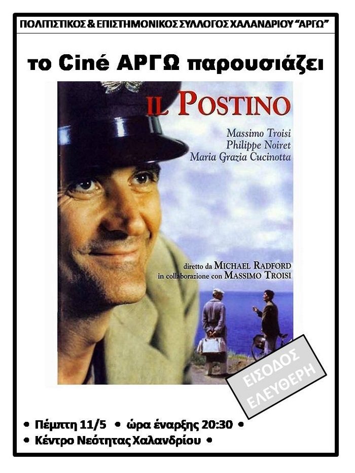 O Πολιτιστικός - Επιστημονικός Σύλλογος Χαλανδρίου «ΑΡΓΩ» συνεχίζει τα ταξίδια του Cine ΑΡΓΩ με την προβολή της υπέροχης και βραβευμένης ταινίας “Il postino”.