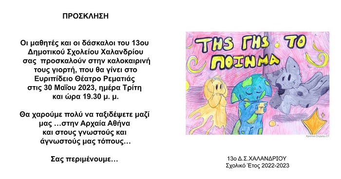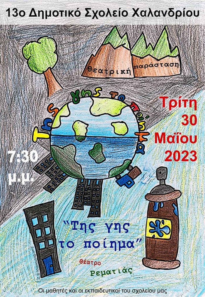 Το 13ο Δημοτικό Σχολείο Χαλανδρίου, με αφορμή τη λήξη της σχολικής χρονιάς 2022-2023, παρουσιάζει τη θεατρική του παράσταση με τίτλο: «Της γης το ποίημα», στο Ευριπίδειο Θέατρο Ρεματιάς, την Τρίτη 30 Μαΐου 2023 και ώρα 19:30.