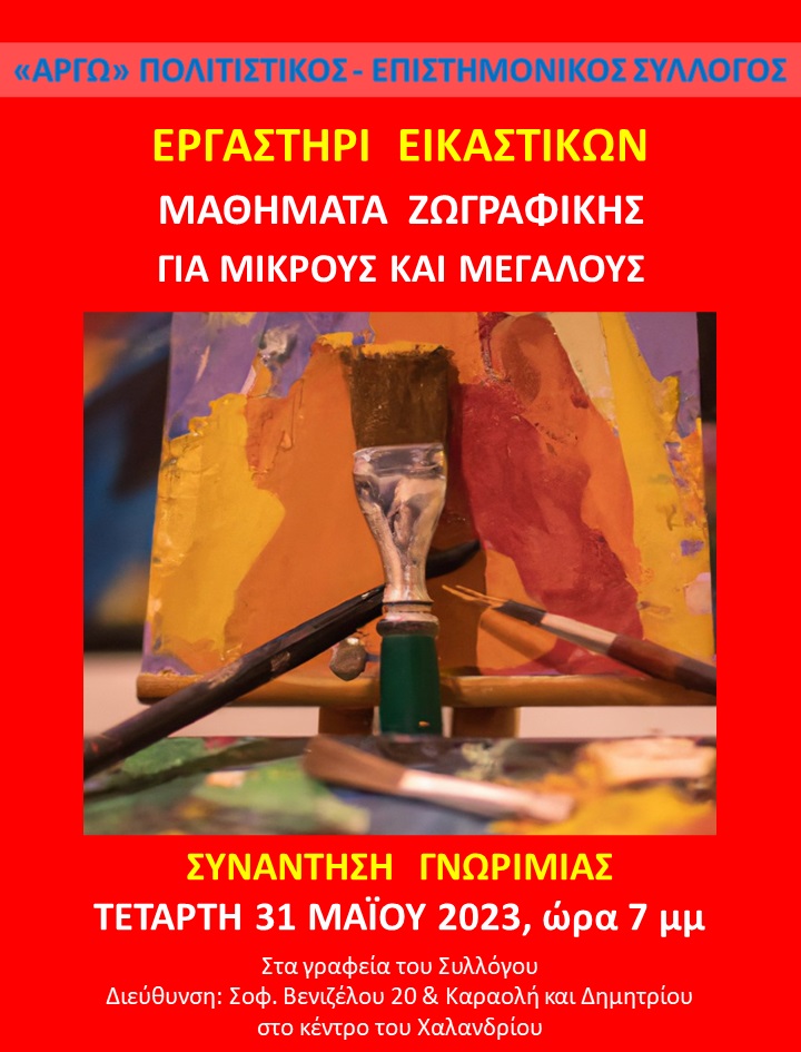 Ο Πολιτιστικός - Επιστημονικός Σύλλογος Χαλανδρίου «ΑΡΓΩ» προχωρά στη δημιουργία Εργαστηρίου Εικαστικών με μαθήματα ζωγραφικής για μικρούς και μεγάλους.