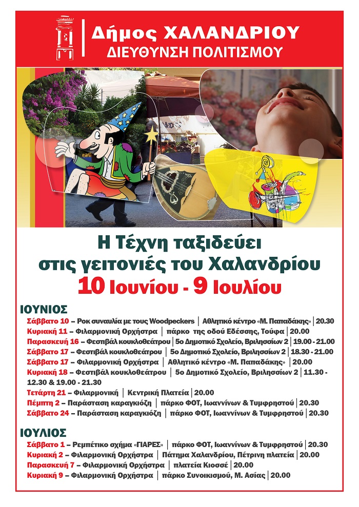 Πολιτιστικές δράσεις σε όλες τις γειτονιές της πόλης θα πραγματοποιήσει η Διεύθυνση Πολιτισμού του Δήμου Χαλανδρίου, από τις 10 Ιουνίου έως τις 9 Ιουλίου 2023.
