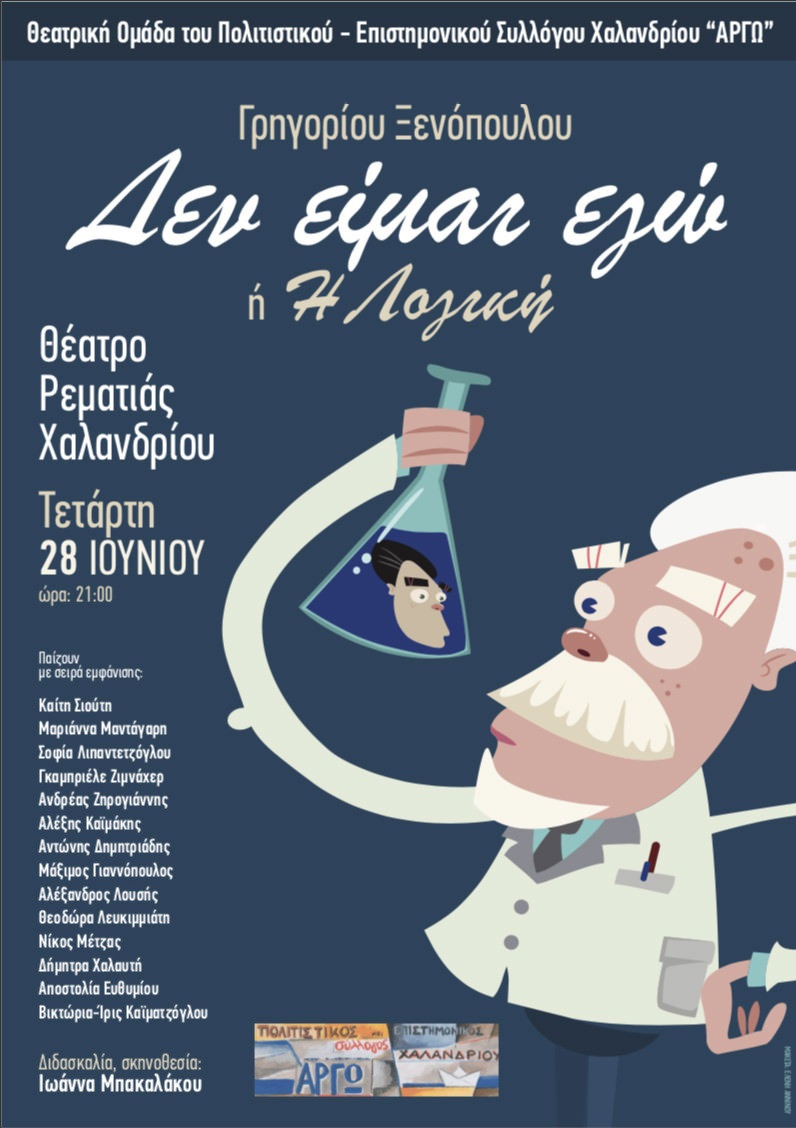Η Θεατρική Ομάδα του Πολιτιστικού - Επιστημονικού Συλλόγου Χαλανδρίου «ΑΡΓΩ» παρουσιάζει το έργο του Γρηγορίου Ξενόπουλου «Δεν είμαι εγώ ή Η Λογική», την Τετάρτη 28 Ιουνίου 2023 και ώρα 21:00, στο Θέατρο Ρεματιάς.