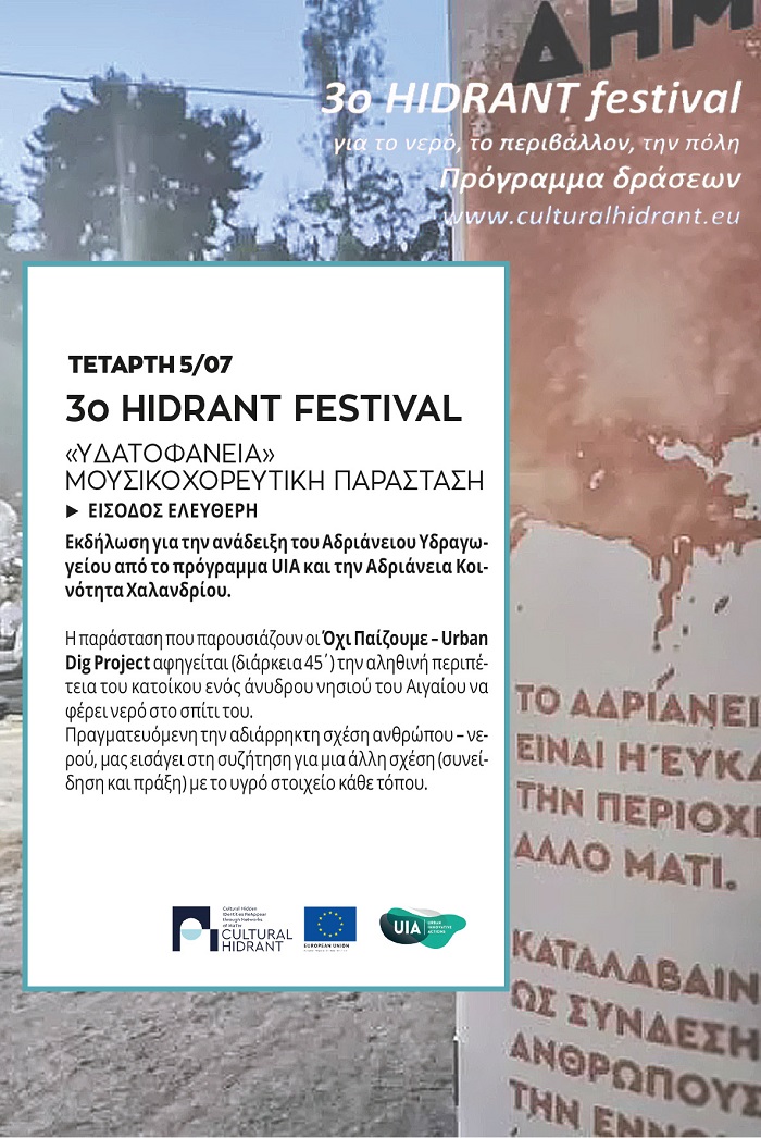 Με τη μουσικοχορετική παράσταση «Υδατοφάνεια», από την ομάδα «Όχι Παίζουμε – Urban Dig Project», το HIDRANT festival έρχεται για τρίτη χρονιά φέτος στο Φεστιβάλ Ρεματιάς, την Τετάρτη 5 Ιουλίου, να μας μιλήσει για το πολυτιμότερο αγαθό μας, το νερό και την αξιοποίησή του από το Αδριάνειο Υδραγωγείο που παίρνει και πάλι ζωή στην πόλη.