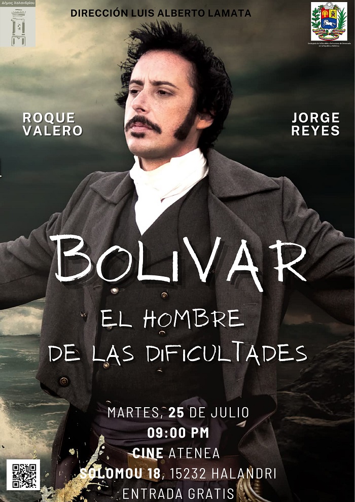 Η πρεσβεία της Μπολιβαριανής Δημοκρατίας της Βενεζουέλας στην Ελλάδα και ο Δήμος Χαλανδρίου, σε συνεργασία με τον θερινό κινηματογράφο «Cine Αθηνά», προβάλλουν την ταινία «Μπολίβαρ, ο αγωνιστής», με αφορμή τη συμπλήρωση των 240 ετών από τη γέννηση του απελευθερωτή της Βενεζουέλας, Σιμόν Μπολίβαρ, στις 24 Ιουλίου 1783, της σημαντικότερης φυσιογνωμίας στον αγώνα ανεξαρτησίας της Λατινικής Αμερικής.