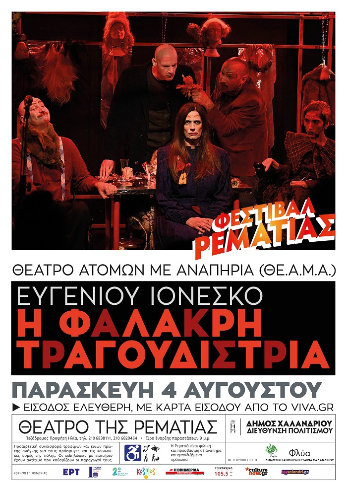 Τη θεατρική παράσταση “Η Φαλακρή Τραγουδίστρια” του Ευγένιου Ιονέσκο από την επαγγελματική συμπεριληπτική (ανάπηρων και μη ανάπηρων ατόμων) θεατρική ομάδα ΘΕΑΜΑ, σε σκηνοθεσία Σοφίας Σταυρακάκη, φιλοξενεί το Φεστιβάλ Ρεματιάς 2023 - Νύχτες Αλληλεγγύης, την Παρασκευή 4 Αυγούστου. Η παράσταση παρουσιάζεται με διερμηνεία στην Ελληνική Νοηματική Γλώσσα (ΕΝΓ) και ακουστική περιγραφή για τυφλά άτομα και άτομα με μειωμένη όραση.