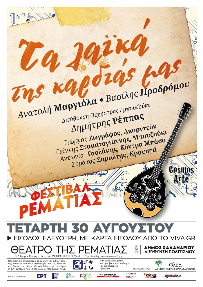 Τη μουσική παράσταση «Τα Λαϊκά της καρδιάς μας» φιλοξενεί το Φεστιβάλ Ρεματιάς 2023 - Νύχτες Αλληλεγγύης την Τετάρτη 30 Αυγούστου. Η Ανατολή Μαργιόλα και ο Βασίλης Προδρόμου στο τραγούδι, με τον Δημήτρη Ρέππα στη μουσική διεύθυνση και το μπουζούκι και άλλους καταξιωμένους μουσικούς, παρουσιάζουν ένα ξεχωριστό οδοιπορικό στο μουσικό τοπίο της μεταπολεμικής Ελλάδας.