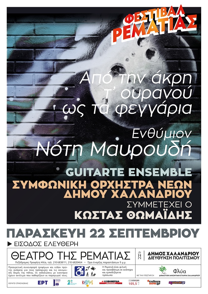 Τη μουσική παράσταση «Ενθύμιον Νότη Μαυρουδή: Από την άκρη τ' ουρανού ως τα φεγγάρια» παρουσιάζει στο Φεστιβάλ Ρεματιάς 2023 - Νύχτες Αλληλεγγύης την Παρασκευή 22 Σεπτεμβρίου, η Συμφωνική Ορχήστρα Νέων Δήμου Χαλανδρίου, υπό τη διεύθυνση του Κώστα Ιωαννίδη σε σύμπραξη με το κιθαριστικό σύνολο Guitarte ensemble (Νίκος Χατζηελευθερίου, Μαρία Παπαμιχαήλ, Χρήστος Φάκλαρης) και τον ερμηνευτή Κώστα Θωμαΐδη.