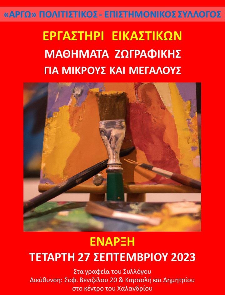 Ο Πολιτιστικός - Επιστημονικός Σύλλογος Χαλανδρίου ΑΡΓΩ προχωρά στη δημιουργία Εργαστηρίου Εικαστικών και μαθήματα ζωγραφικής για μικρούς και μεγάλους.
