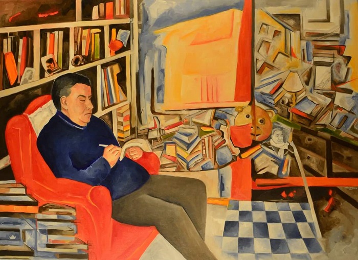 ...«Και μια και αναφερθήκαμε στα ποιήματα, σε μια άλλη σειρά έργων, τα όποια ξεκίνησαν και στηρίζονται περισσότερο στα πρόσωπα των ποιητών και στα γραπτά τους, οι πίνακές εκεί, πιο πολύ από κάθε άλλη φορά, παρά την αδιόρατα νεκρή φύση που ένα έμπειρο όμως μάτι διακρίνει σε ολόκληρο το έργο του ζωγράφου, βγάζουν μέσα μας μιαν ευφρόσυνη γλύκα καλοκαιρινής βραδιάς στο πατρικό μας, παλιά, στην εξοχή...».