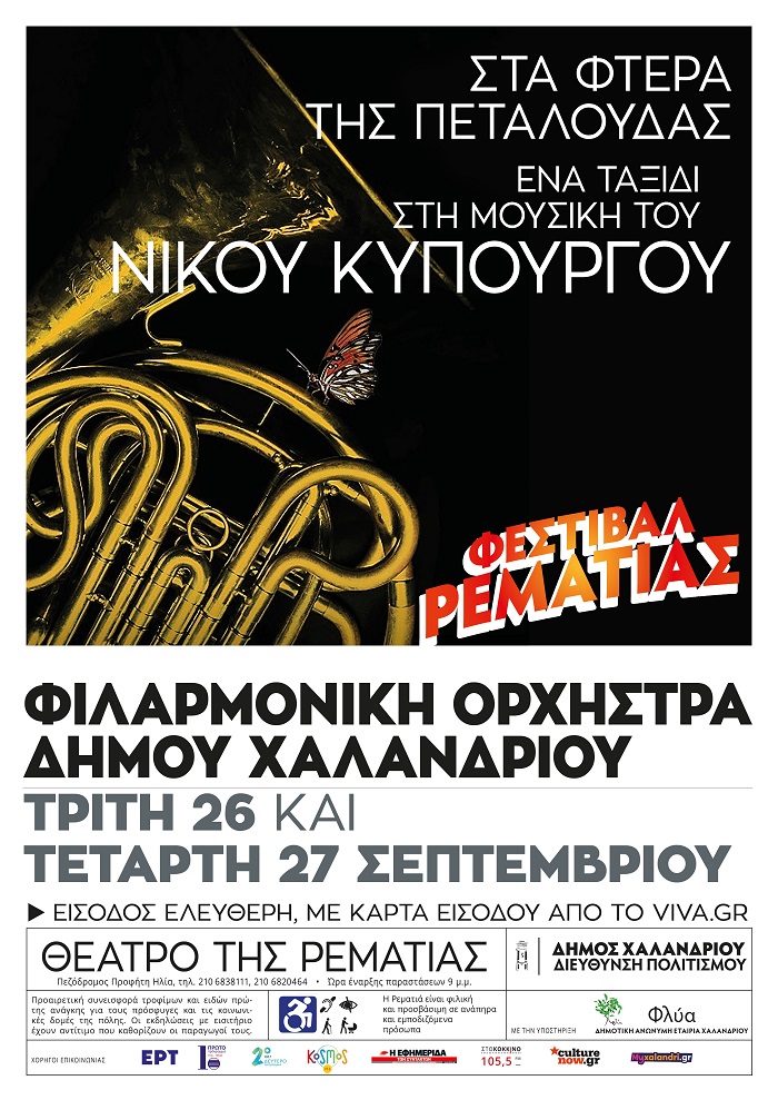 Τη μουσική παράσταση «Στα φτερά της πεταλούδας: ένα ταξίδι στις μουσικές του Νίκου Κυπουργού» παρουσιάζει την Τρίτη 26 και την Τετάρτη 27 Σεπτεμβρίου* στο Φεστιβάλ Ρεματιάς 2023 - Νύχτες Αλληλεγγύης, η Φιλαρμονική Ορχήστρα Δήμου Χαλανδρίου υπό τη διεύθυνση του αρχιμουσικού της, Κώστα Ιωαννίδη. Στο πόντιουμ θα βρεθεί και ο ίδιος ο συνθέτης. Τα κείμενα της συναυλίας υπογράφει η Μαρία Παπαγιάννη, τη μεταγραφή για ορχήστρα πνευστών ο Μαρίνος Γαλατσινός (και ο Νίκος Κυπουργός) και τη σκηνοθεσία ο Θοδωρής Αμπαζής. Στην αφήγηση ο Μανώλης Μαυροματάκης.