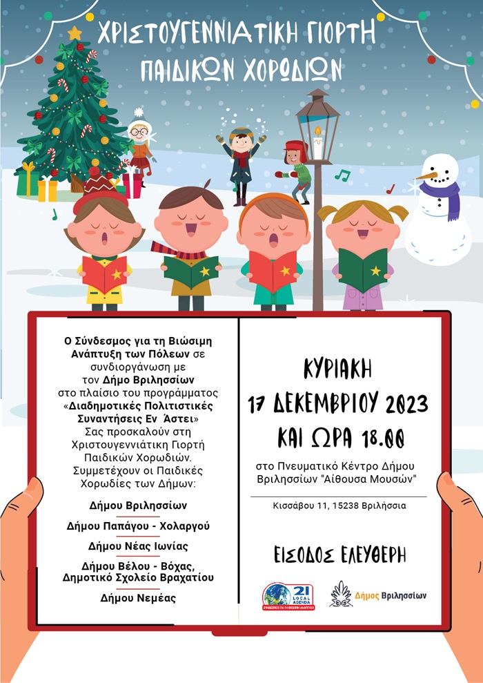 Παιδιά από τις Παιδικές Χορωδίες πέντε Δήμων, Βριλησσίων, Παπάγου-Χολαργού, Νέας Ιωνίας, Βέλου-Βόχας και Δήμου Νεμέας θα μας χαρίσουν όμορφες στιγμές τραγουδώντας χριστουγεννιάτικα τραγούδια.