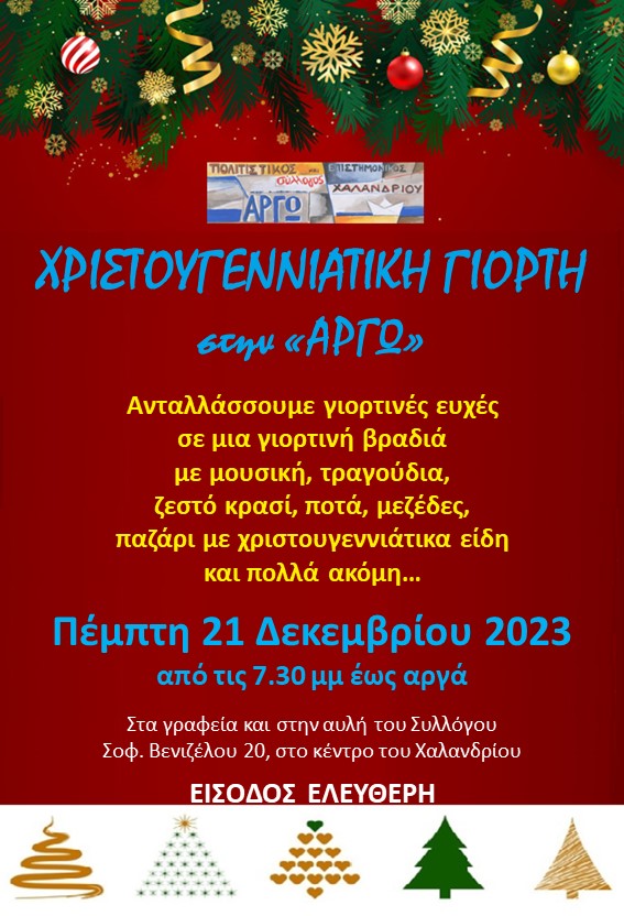 Ο Πολιτιστικός - Επιστημονικός Σύλλογος Χαλανδρίου ΑΡΓΩ διοργανώνει Χριστουγεννιάτικη Γιορτή.