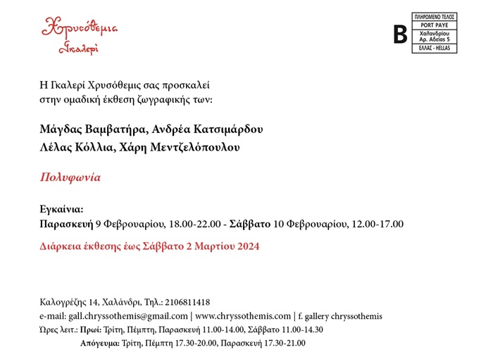 “Πολυφωνία”: Ομαδική έκθεση ζωγραφικής στην Γκαλερί Χρυσόθεμις, στο Χαλάνδρι