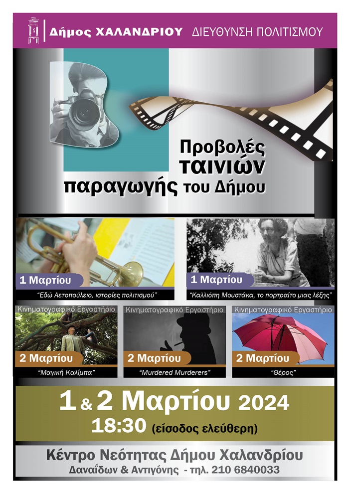 Το Σάββατο 2 Μαρτίου 2024 θα προβληθούν οι ταινίες που έχουν παραχθεί στο πλαίσιο του Κινηματογραφικού Εργαστηρίου Δήμου Χαλανδρίου: