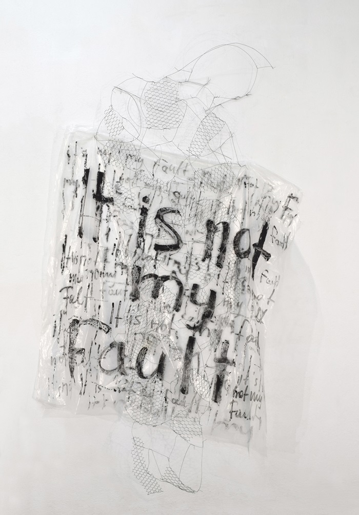 Στο “It’s not my fault” (Δεν φταίω εγώ) συνθέτει θραύσματα από αστικά συντρίμμια με την τολμηρή αισθητική της τέχνης του δρόμου, δημιουργώντας έναν κώδικα που αντανακλά την πολυπλοκότητα του σύγχρονου κόσμου.