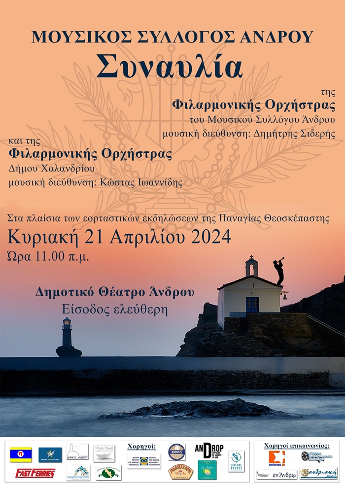 Στις εορταστικές εκδηλώσεις της Πανανδριακής Εορτής της Παναγίας Θεοσκέπαστης που θα γίνουν το Σαββατοκύριακο 20 και 21 Απριλίου 2024 στην Άνδρο, συμμετέχει η Φιλαρμονική Ορχήστρα Δήμου Χαλανδρίου, φιλοξενούμενη της Φιλαρμονικής Ορχήστρας του Μουσικού Συλλόγου Άνδρου.