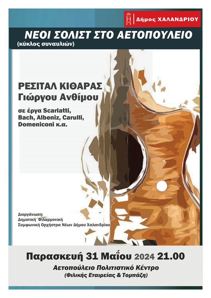 Αυτή τη φορά, παρουσιάζεται ο σολίστ Γιώργος Άνθιμος σε ένα ρεσιτάλ κιθάρας με έργα Scarlatti, Bach, Albeniz, Carulli, Domeniconi κ.α., την Παρασκευή 31 Μαΐου 2024, στις 21:00 στο Αετοπούλειο Πολιτιστικό κέντρο Δήμου Χαλανδρίου (Τομπάζη 18 & Φιλικής Εταιρείας).