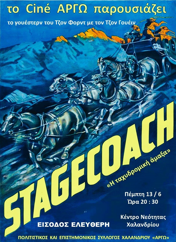 Ο Πολιτιστικός - Επιστημονικός Σύλλογος Χαλανδρίου ΑΡΓΩ προσκαλεί στην προβολή του γουέστερν «Stagecoach»: